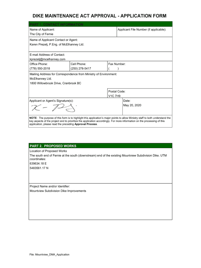 DIKE MAINTENANCE ACT APPROVAL APPLICATION FORM PART 1. CONTACT INFORMATION Name of Applicant: The City of FernieApplicant File Number (if applicable):Name of Applicant Contact or Agent: Karen Pretzel,