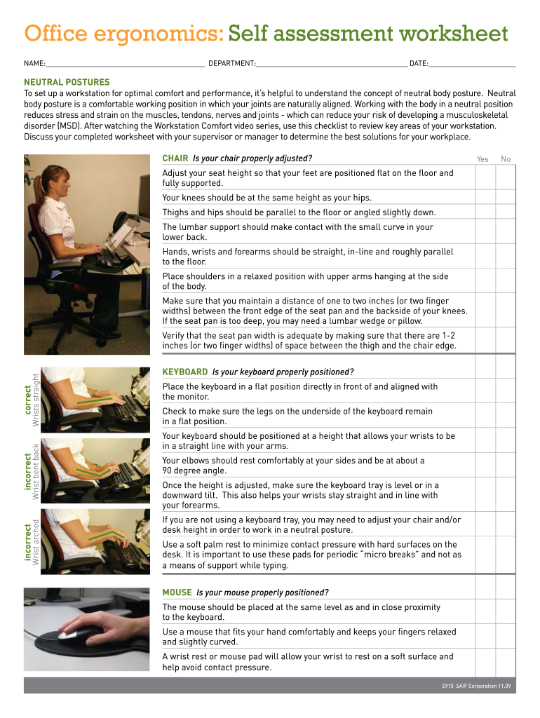 Office ergonomics: Self assessment worksheet Name: Department: Date: Neutral Postures To set up a workstation for optimal comfort and performance, it's helpful to understand the concept of neutral