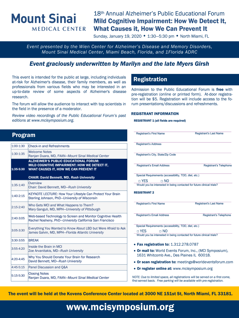 18th Annual Alzheimer's Public Educational ForumMild Cognitive Impairment: How We Detect It, What Causes it, How We Can Prevent It Sunday, January 19, 2020 1:305:30 pm North Miami, FLE vent presented