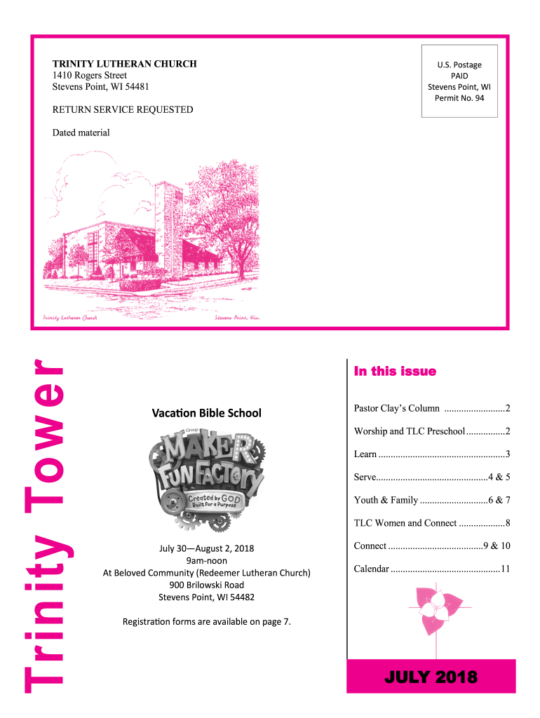 TRINITY LUTHERAN CHURCH 1410 Rogers Street Stevens Point, WI 54481U. S. Postage PAID Stevens Point, WI Permit No. 94RETURN SERVICE REQUESTED Dated material In this issue Vacation Bible Schoolmaster