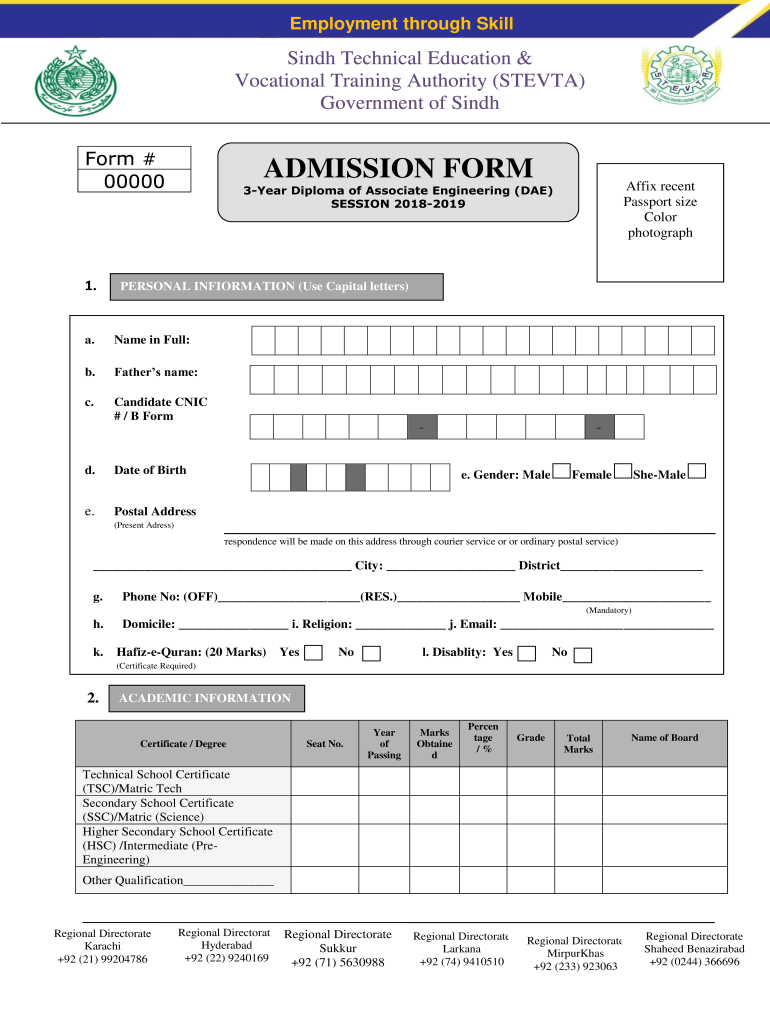 Employment through Training Technical Education & Vocational Training Authority (STE VTA) Government of Sindh Form # 000001.ADMISSION Formalin recent Passport size Color photograph3Year Diploma of