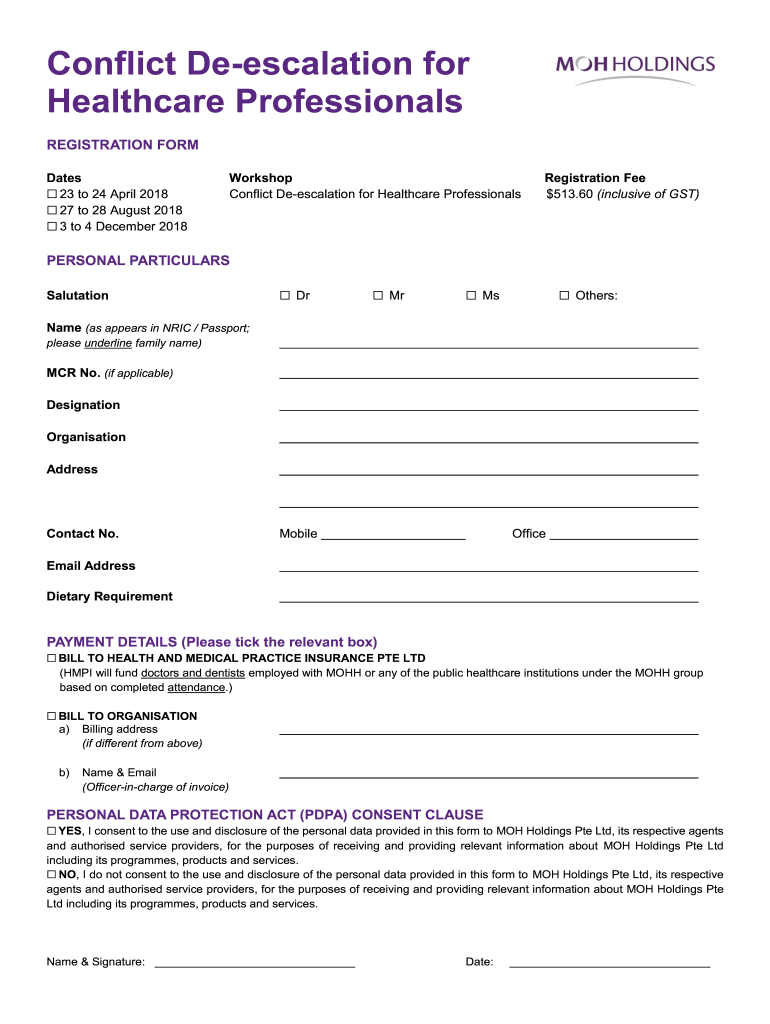 Conflict Deescalation for Healthcare Professionals REGISTRATION FORM Dates 23 to 24 April 2018 27 to 28 August 2018 3 to 4 December 2018Workshop Conflict Deescalation for Healthcare ProfessionalsRegistration