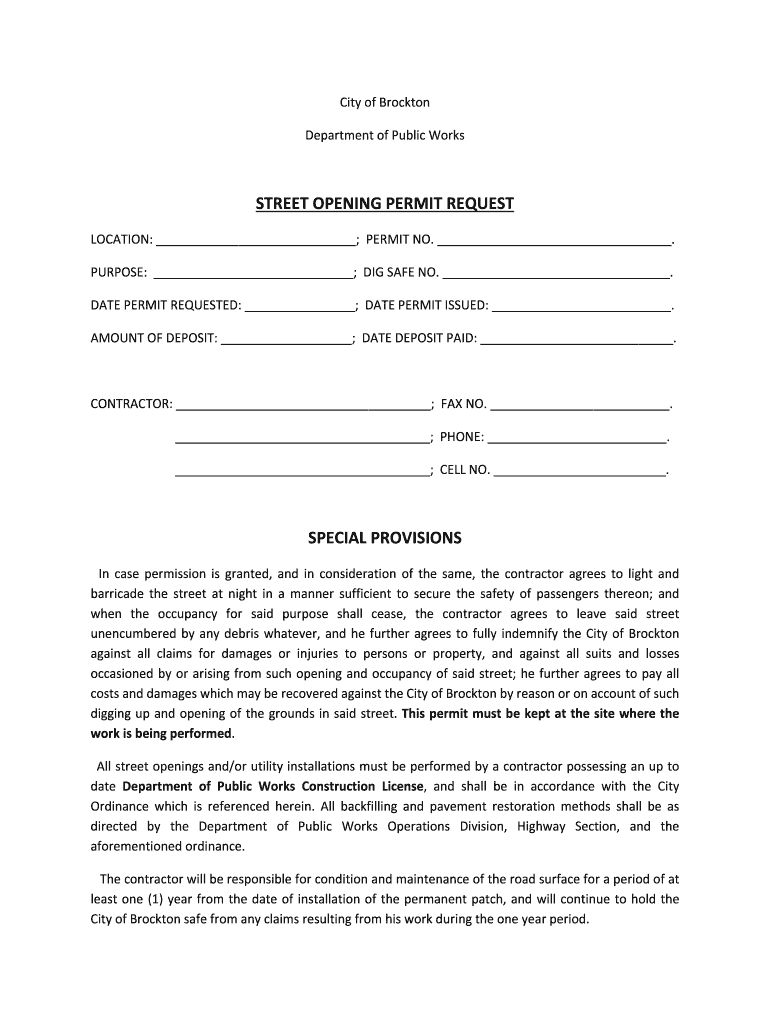 CityofBrockton DepartmentofPublicWorks STREETOPENINGPERMITREQUEST LOCATION: ;PERMIT NO. . PURPOSE: ;DIGSAFENO. . DATEPERMITREQUESTED: ;DATEPERMITISSUED:. AMOUNTOFDEPOSIT: ;DATEDEPOSITPAID:. CONTRACTOR: