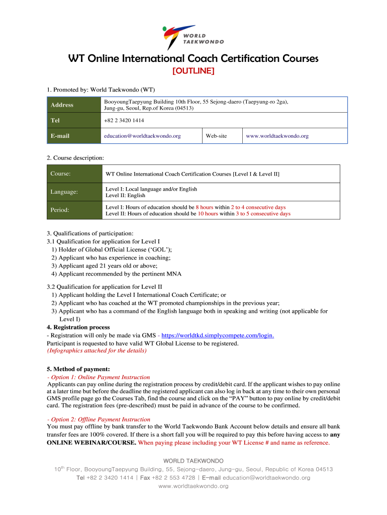 WT Online International Coach Certification Courses OUTLINE 1. Promoted by: World Taekwondo (WT) AddressBooyoungTaepyung Building 10th Floor, 55 Sejongdaero (Taehyung 2ga), Jungle, Seoul, Rep. Of