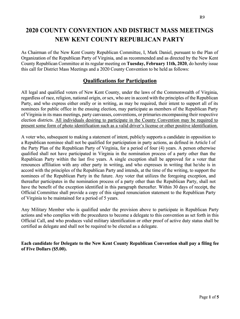 As Chairman of the New Kent County Republican Committee, I, Mark Daniel, pursuant to the Plan of