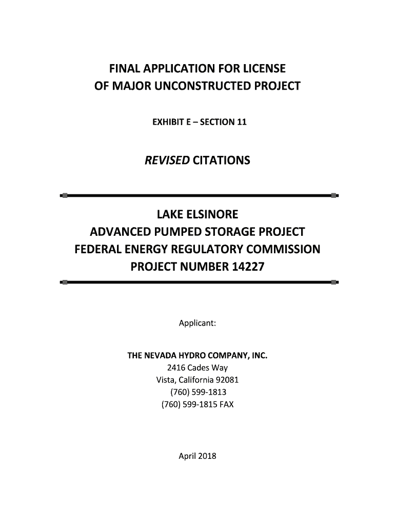 FINAL APPLICATION FOR LICENSE OF MAJOR CONSTRUCTED PROJECT EXHIBIT E SECTION 11REVISED CITATIONSLAKE ELSINORE ADVANCED PUMPED STORAGE PROJECT FEDERAL ENERGY REGULATORY COMMISSION PROJECT NUMBER 14227Applicant: