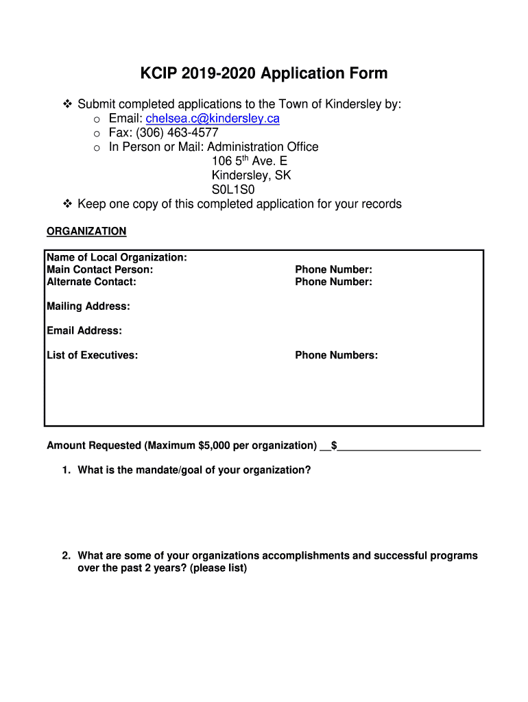 Non-profit organizations and community groups in Kindersley are required to file the Kindersley Community Initiatives Program.