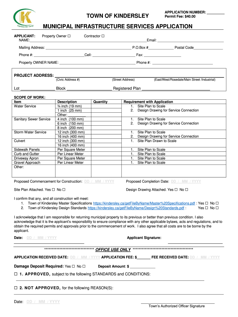 APPLICATION NUMBER: Permit Fee: $40.00TOWN OF KINDERSLEYMUNICIPAL INFRASTRUCTURE SERVICES APPLICATION APPLICANT: Property Owner Contractor NAME: Email: Mailing Address: P.O. Box # Postal Code Phone