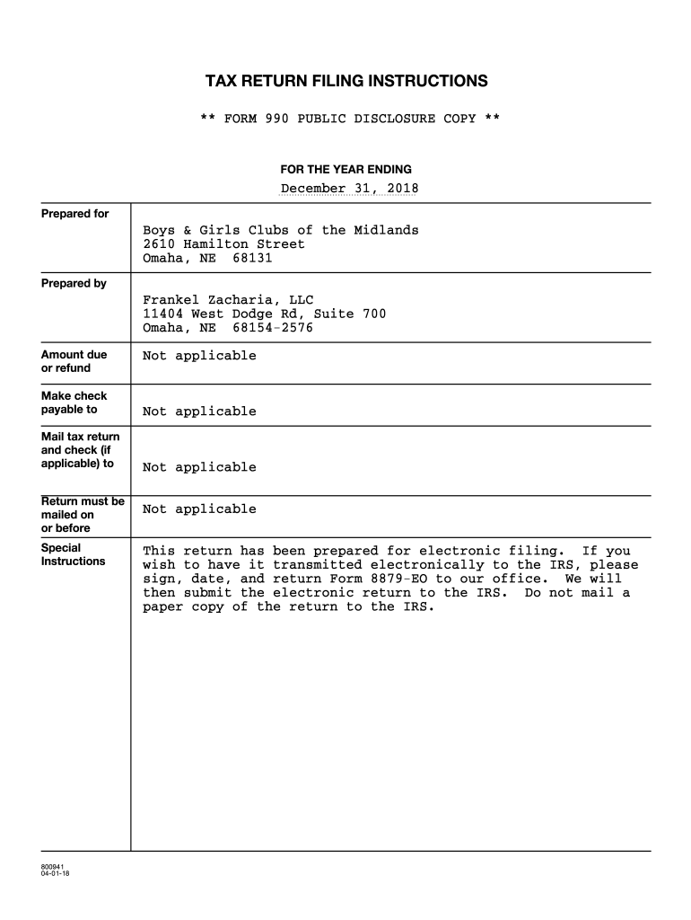TAX RETURN FILING INSTRUCTIONS ** FORM 990 PUBLIC DISCLOSURE COPY **FOR THE YEAR ENDING December 31, 2018, Prepared amount due or refunds & Girls Clubs of the Midlands 2610 Hamilton Street Omaha,