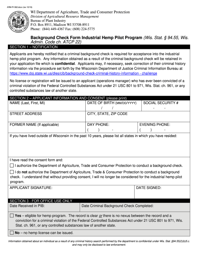 Get the free Background Check Form Industrial Hemp Pilot Program (Wis. Stat ...