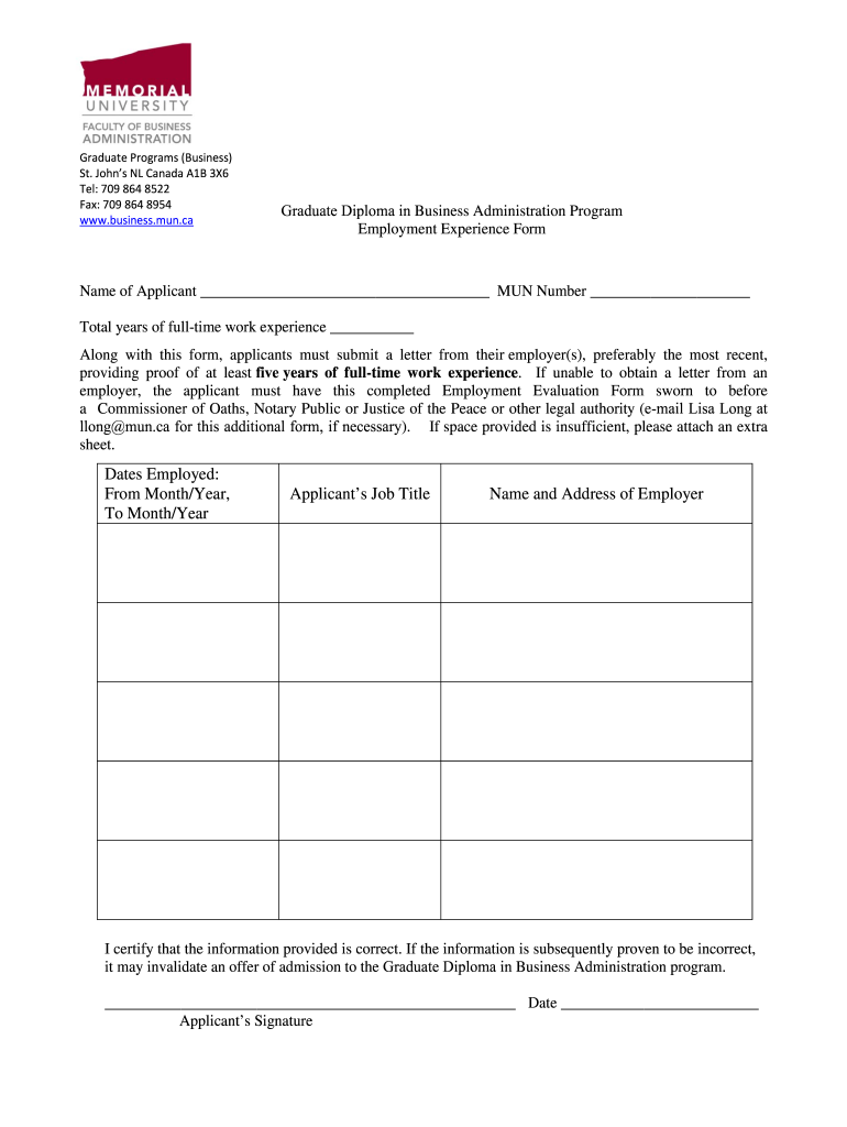 Graduate Programs (Business) St. Johns NL Canada A1B 3×6 Tel: 709 864 8522 Fax: 709 864 8954 www.business.mun.caGraduate Diploma in Business Administration Program Employment Experience Forename