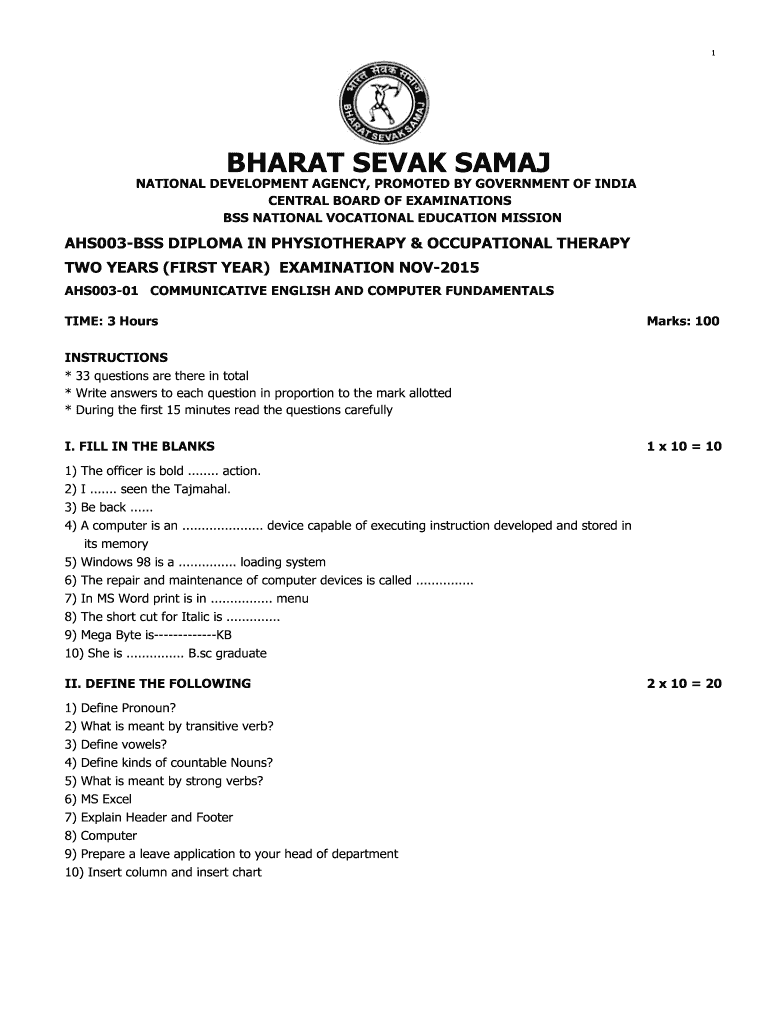 1BHARAT SEV AK SAMAJNATIONAL DEVELOPMENT AGENCY, PROMOTED BY GOVERNMENT OF INDIA CENTRAL BOARD OF EXAMINATIONS BSS NATIONAL VOCATIONAL EDUCATION MISSIONAHS003BSS DIPLOMA IN PHYSIOTHERAPY & OCCUPATIONAL