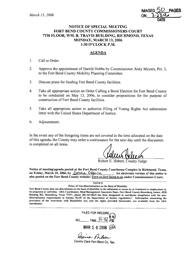 '5IMAGED D PAGES ON J. March 13, 2006DATE NOTICE OF SPECIAL MEETING FORT BEND COUNTY COMMISSIONERS COURT 7TH FLOOR, WM. B. TRAVIS BUILDING, RICHMOND, TEXAS MONDAY, MARCH 13, 2006 1:30. AGENDA 1. Call