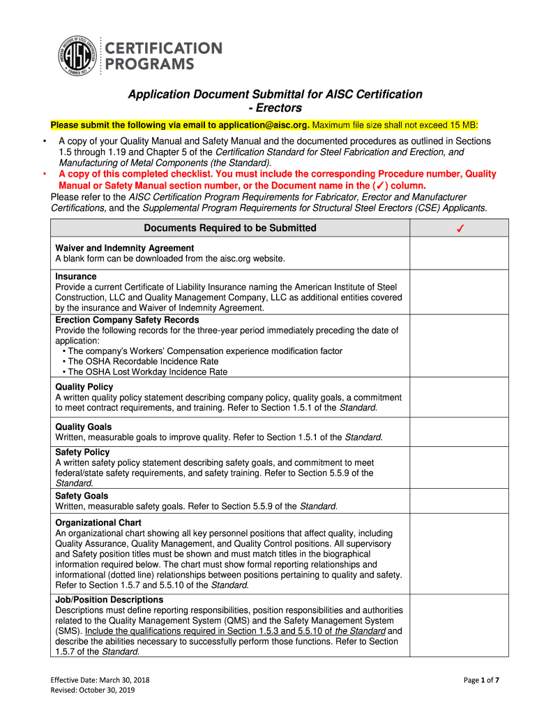 Application Document Submittal for DISC Certification Erectors Please submit the following via email to application disc.org. Maximum file size shall not exceed 15 MB:A copy of your Quality Manual