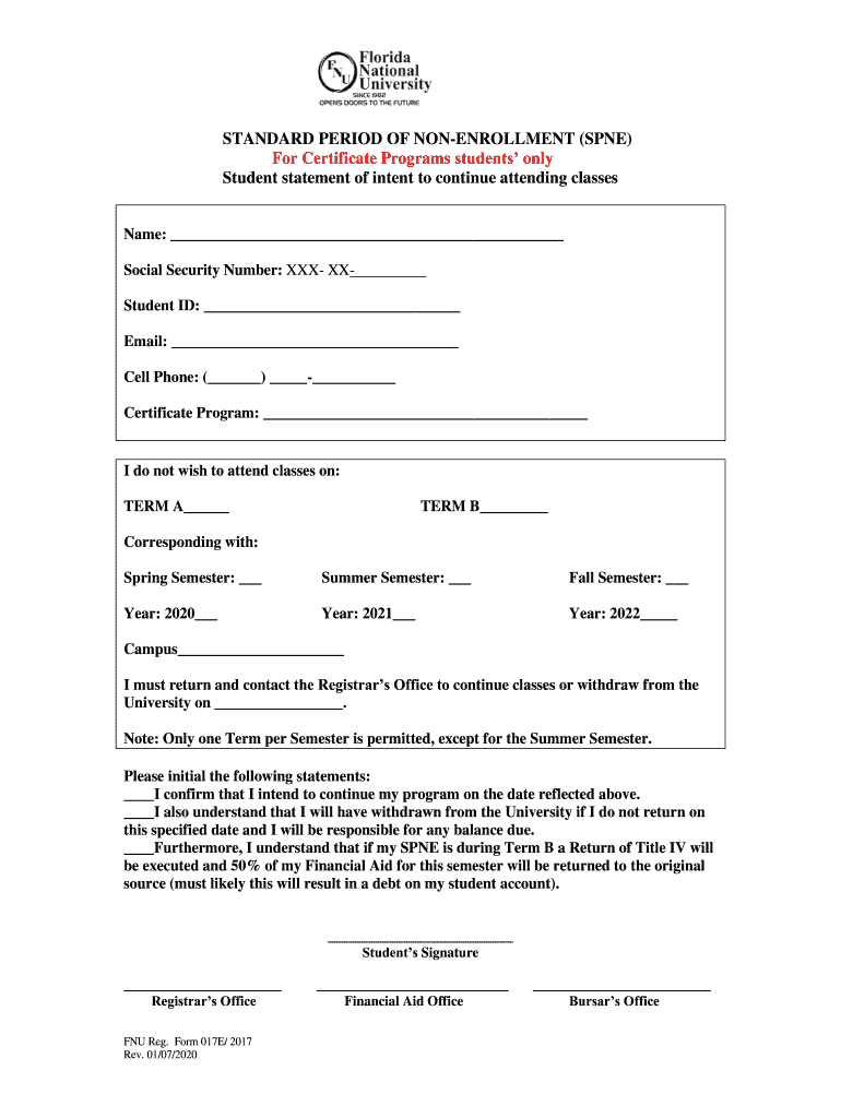STANDARD PERIOD OF ENROLLMENT (SPINE) For Certificate Programs students only Student statement of intent to continue attending classes Name: Social Security Number: XXX Student ID: Email: Cell Phone: