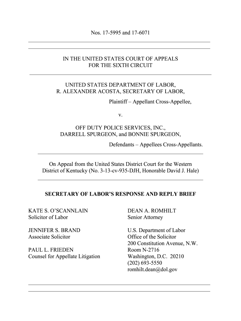 Nos. 175995 and 176071 IN THE UNITED STATES COURT OF APPEALS FOR THE SIXTH CIRCUIT UNITED STATES DEPARTMENT OF LABOR, R. ALEXANDER ACOSTA, SECRETARY OF LABOR, Plaintiff Appellant CrossAppellee, v.