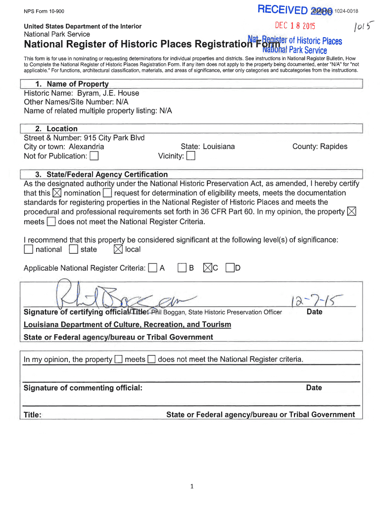 RECEIVED 2 10240018NPS Form 10900United States Department of the Interior DEC 1 8 2015National Park Service. Ill ')National Register of Historic Places Registration, TER of History Places Anchal Park