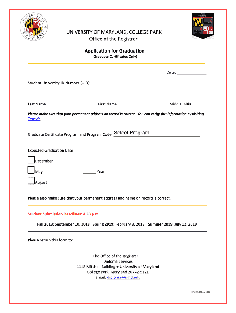 UNIVERSITYOFMARYLAND, COLLEGEPARKOfficeoftheRegistrar ApplicationforGraduation (GraduateCertificatesOnly) Date: StudentUniversityIDNumber(UID): Hostname Filename MiddleInitial Pleasemakesurethatyourpermanentaddressonrecordiscorrect.