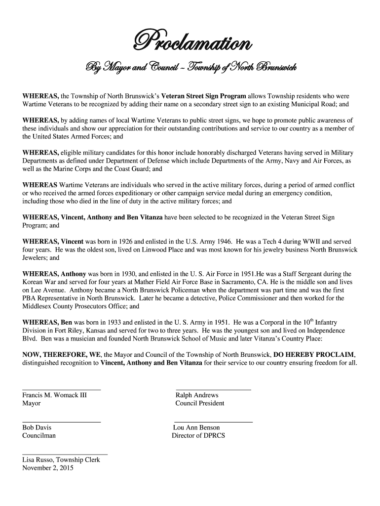 Proclamation Mayor and Council Township of North Brunswick WHEREAS, the Township of North Brunswick's Veteran Street Sign Program allows Township residents who were Wartime Veterans to be recognized