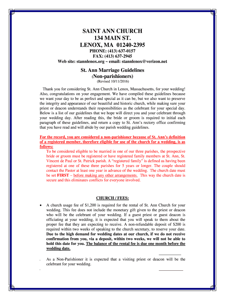 SAINT ANN CHURCH 134 MAIN ST. LENO, MA 012402395 PHONE: (413) 6370157 FAX: (413) 6372945 Website: stannlenox.org email: stannlenox Verizon.nest. Ann Marriage Guidelines (Nonparishioners) (Revised