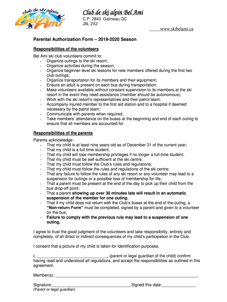 Club DE ski alpine Bel Ami C.P. 2843 Gatineau QC J8L 2×2www.skibelami.ca Parental Authorization Form 20192020 Season Responsibilities of the volunteers Bel Ami ski club volunteers commit to: Organize