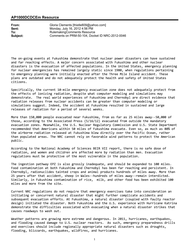 AP1000DCDCEm Resource From: Sent: To: Subject:Gloria Clements thistle809 yahoo.com Monday, July 16, 2012 4:56 PM RulemakingComments Resource Comments on PRM50104, Docket ID NRC20120046The ongoing