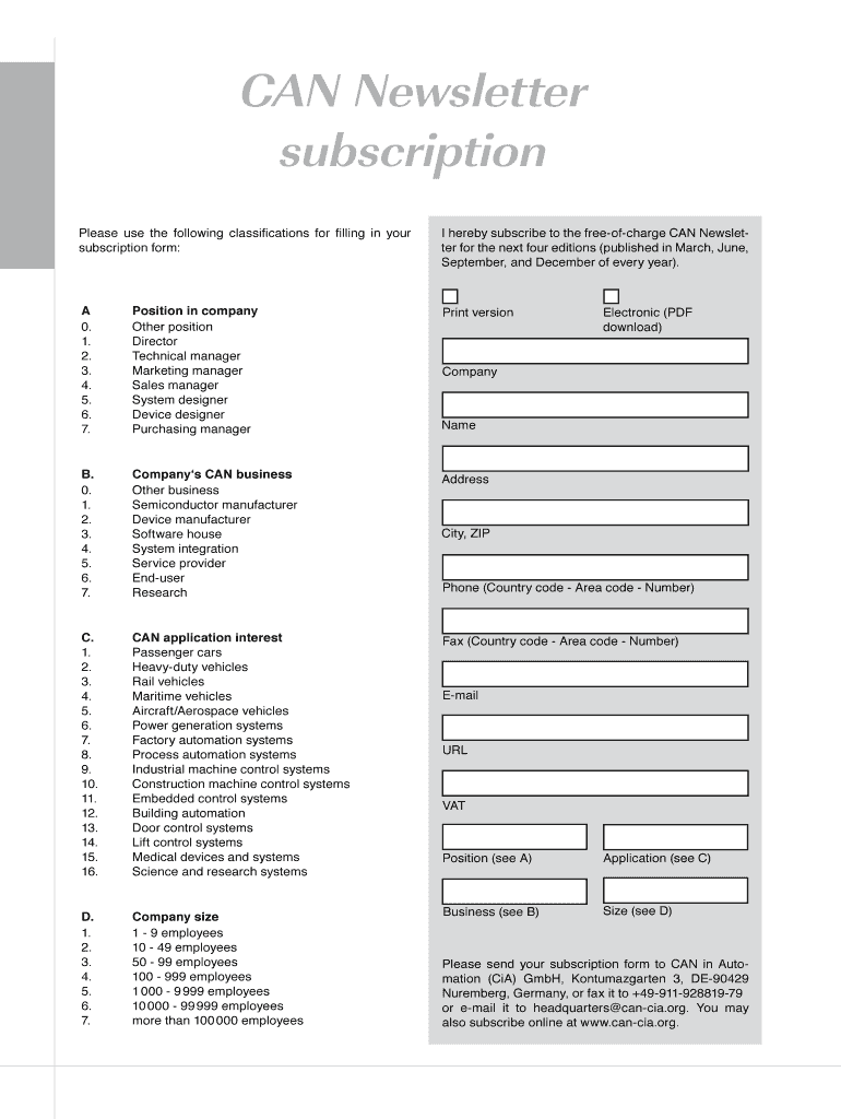 The CAN Newsletter Subscription Form is designed for users who wish to subscribe to the CAN Newsletter, which offers insights related to CAN automation. Subscribers receive editions of the newsletter four times a year, in March, June, September, and December. The form is available for both digital and physical submission, accommodating different preferences for engagement.