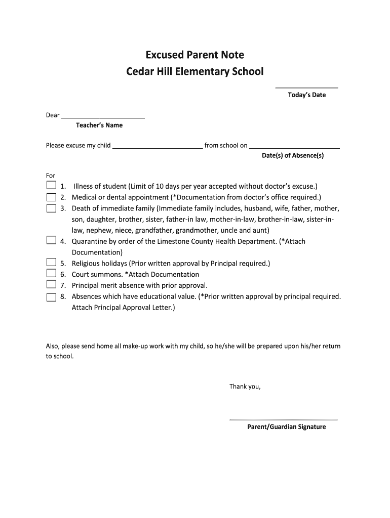 Excused Parent Note Cedar Hill Elementary School Today's Date Dear Teachers Name Please excuse my child from school on Date(s) of Absence(s) For1. Illness of student (Limit of 10 days per year accepted
