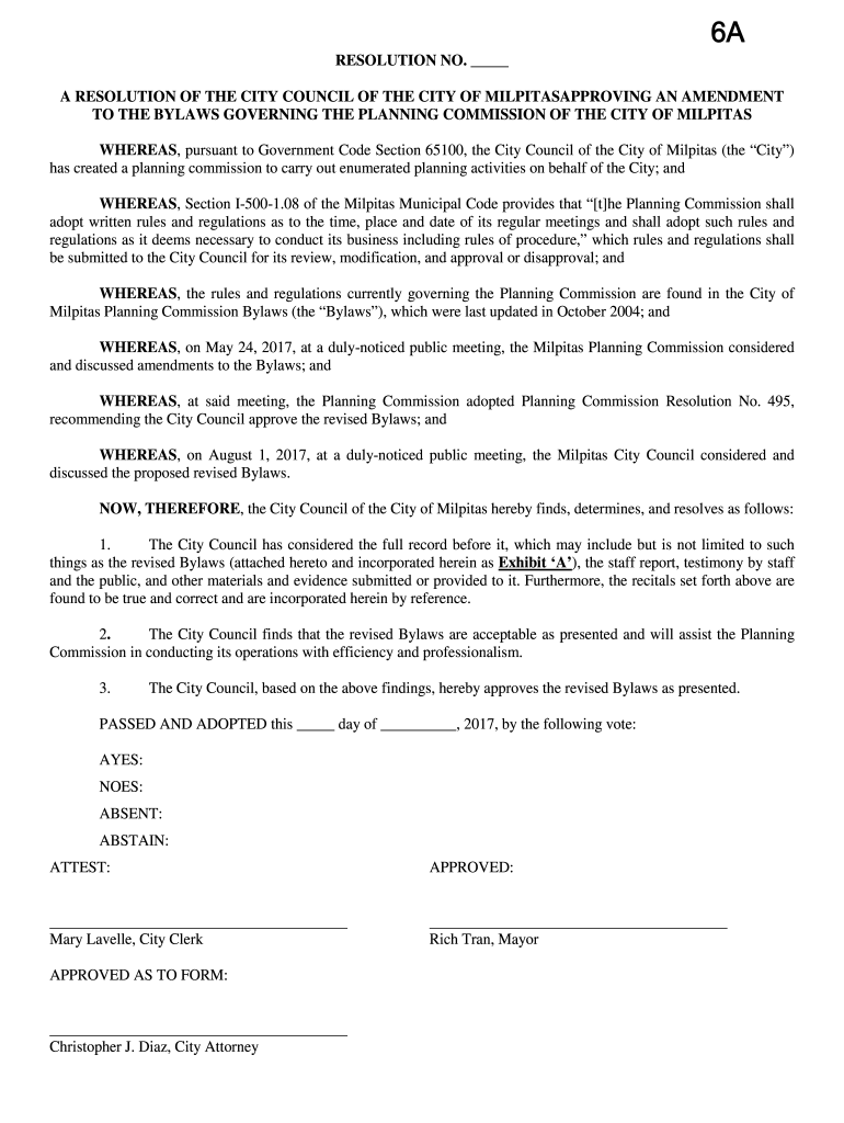6A RESOLUTION NO. A RESOLUTION OF THE CITY COUNCIL OF THE CITY OF MILPITASAPPROVING AN AMENDMENT TO THE BYLAWS GOVERNING THE PLANNING COMMISSION OF THE CITY OF MILPITAS WHEREAS, pursuant to Government