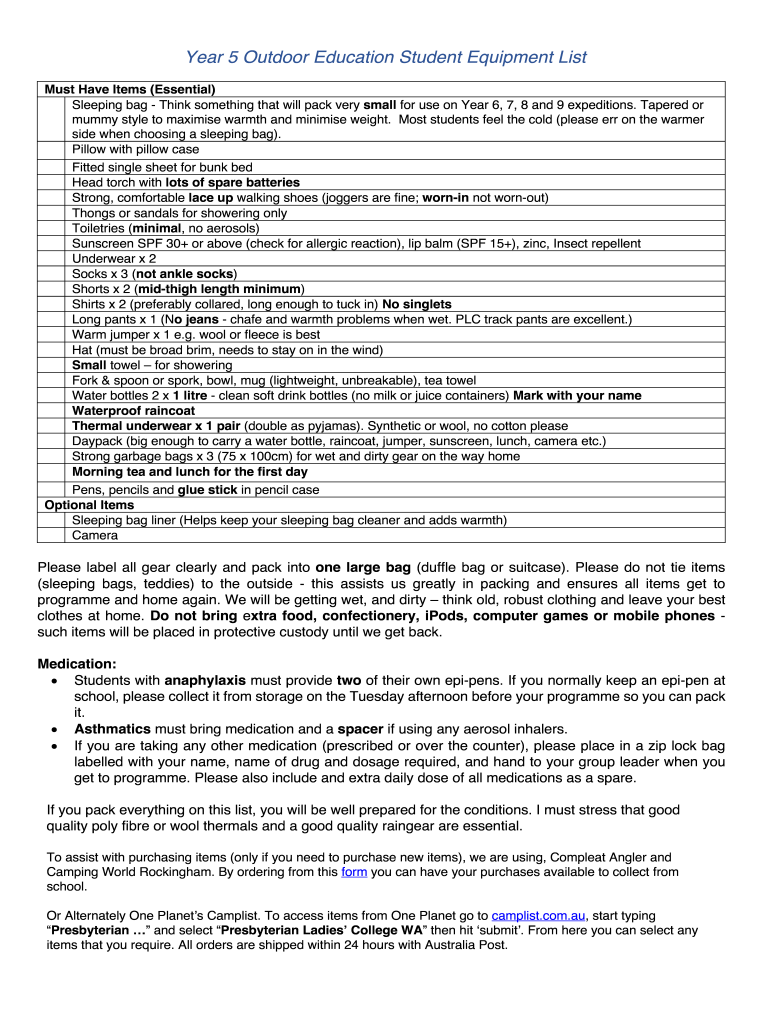Year 5 Outdoor Education Student Equipment List Must Have Items (Essential) Sleeping bag Think something that will pack very small for use on Year 6, 7, 8 and 9 expeditions. Tapered or mummy style