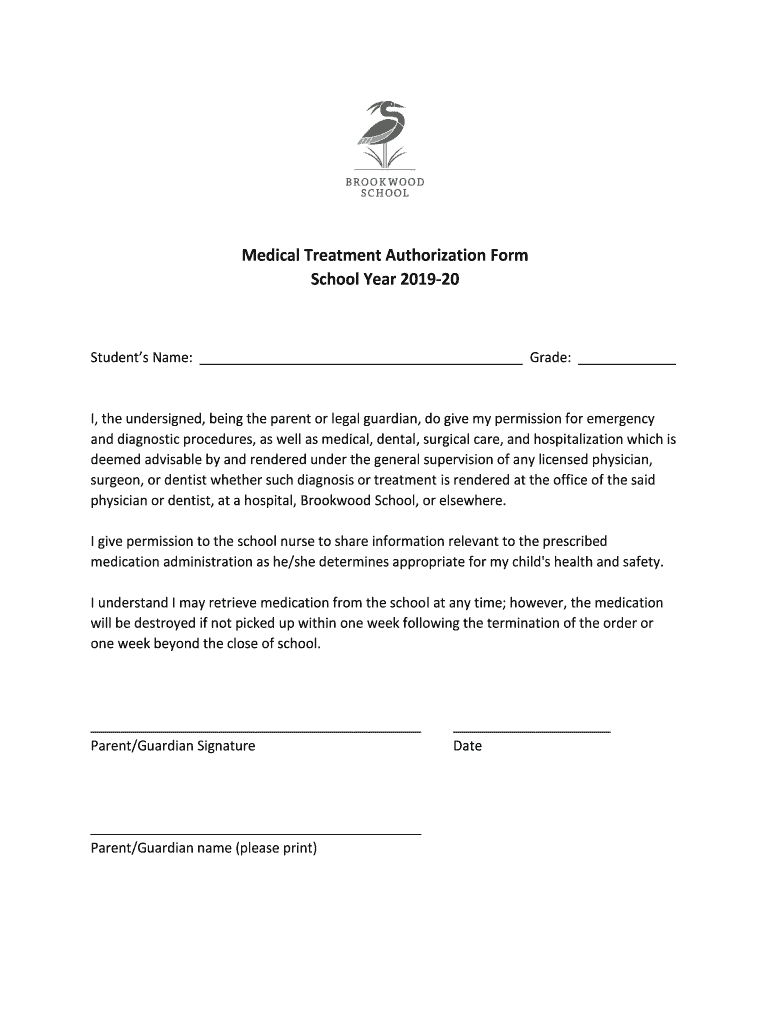 Medical Treatment Authorization Form School Year 201920Students Name: Grade: I, the undersigned, being the parent or legal guardian, do give my permission for emergency and diagnostic procedures,