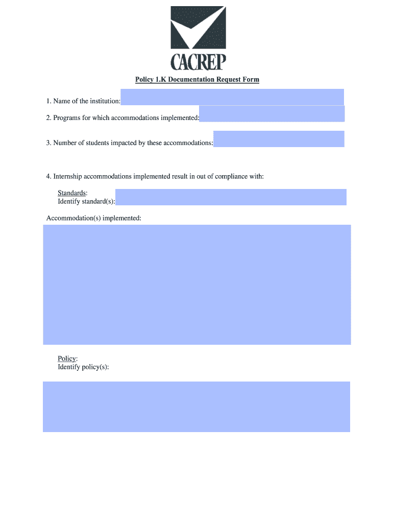 Policy 1. K Documentation Request Form 1. Name of the institution: 2. Programs for which accommodations implemented: 3. Number of students impacted by these accommodations: 4. Internship accommodations