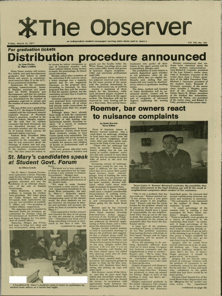 The Observer an in d EP en d en t stud en t new SP a p her serve in g note d an m e and st. m ARY's Friday, M.Arch. 25, 1977. Vol. XII, No. 101For graduation ticketsDistribution procedure announced