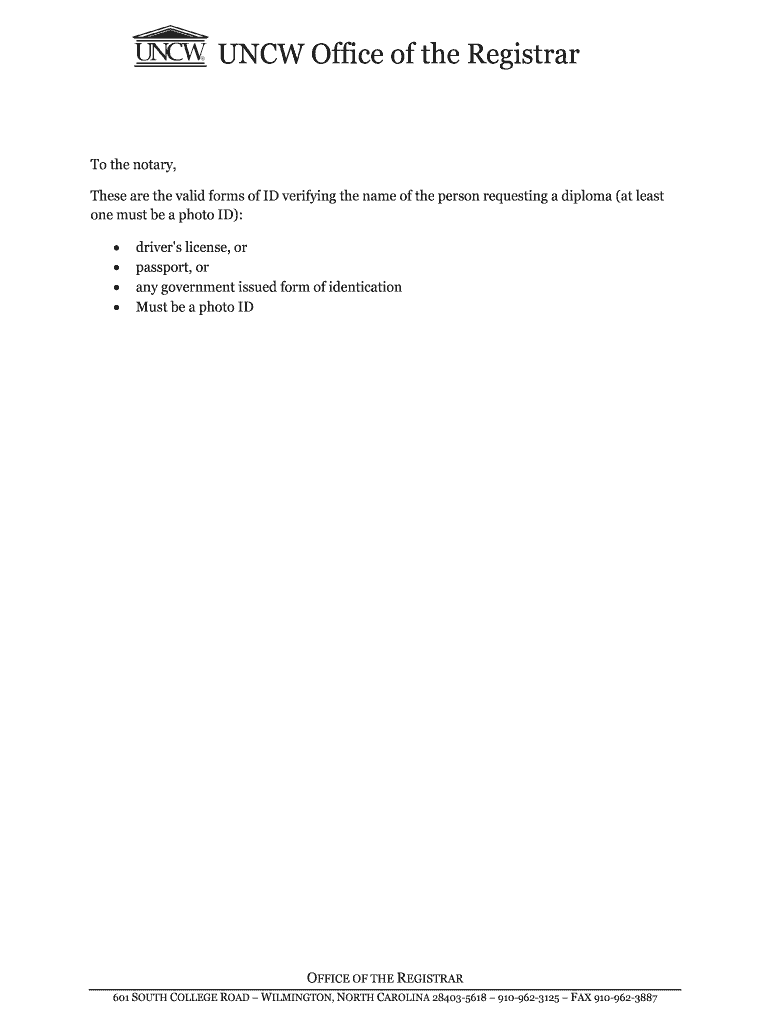 UNC Office of the Registrar the notary, These are the valid forms of ID verifying the name of the person requesting a diploma (at least one must be a photo ID): driver's license, or passport, or any