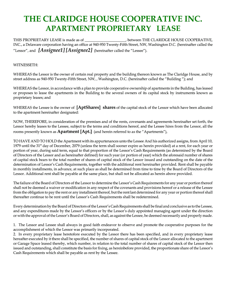 THE COLERIDGE HOUSE COOPERATIVE INC. APARTMENT PROPRIETARY LEASE THIS PROPRIETARY LEASE is made as of, between THE COLERIDGE HOUSE COOPERATIVE, INC., a Delaware corporation having an office at 940950