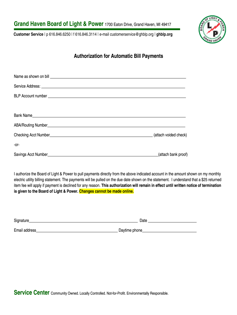 Grand Haven Board of Light & Power 1700 Eaton Drive, Grand Haven, MI 49417 Customer Service p 616.846.6250 f 616.846.3114 email customer service film.org film. Preauthorization for Automatic Bill
