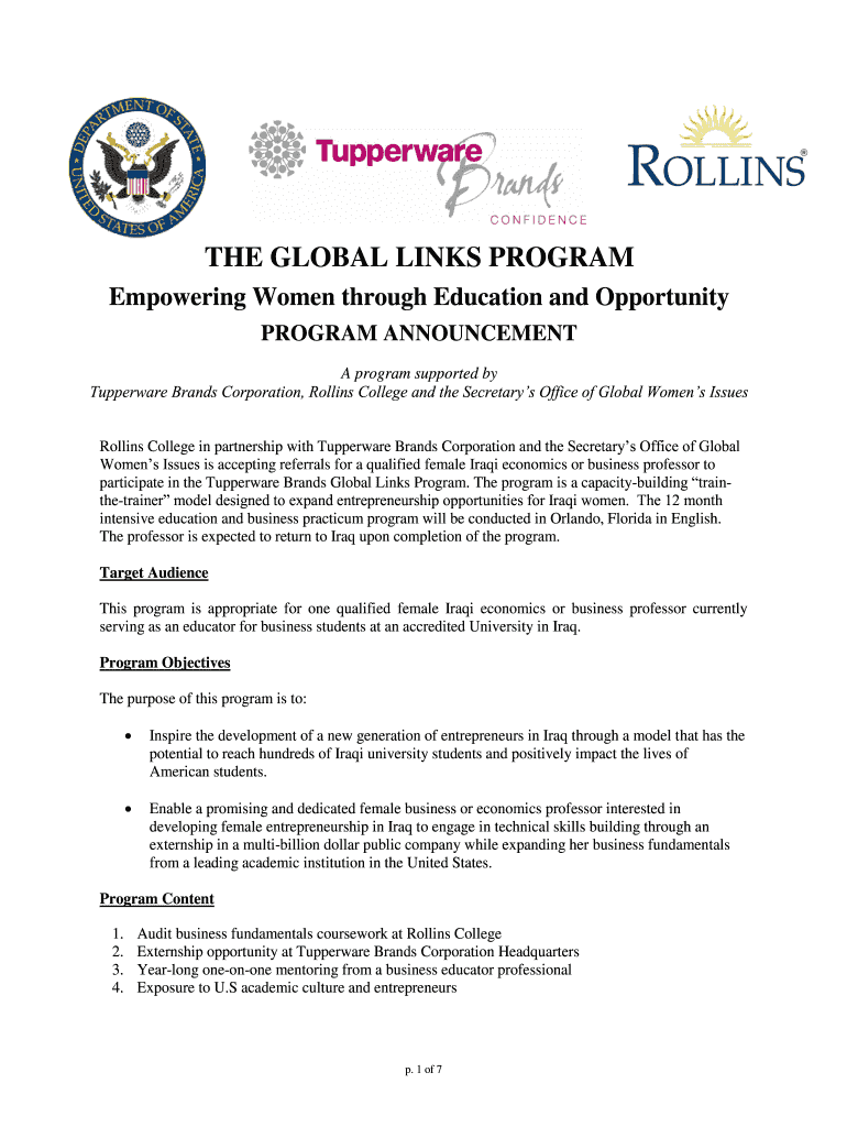 Tupperware Brands Corporation, Rollins College and the Secretary's Office of