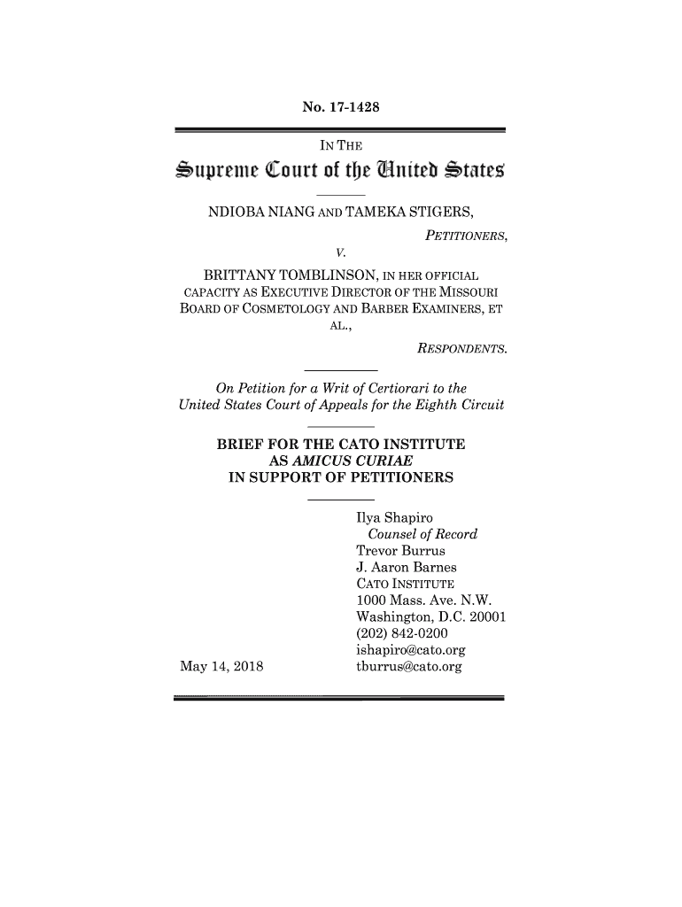 No. 171428 IN THE NIOBE NI ANG AND TAMEKA TIGERS, PETITIONERS, V.BRITTANY TOMLINSON, IN HER OFFICIAL CAPACITY AS EXECUTIVE DIRECTOR OF THE MISSOURIBOARD OF COSMETOLOGY AND BARBER EXAMINERS, ET AL.,