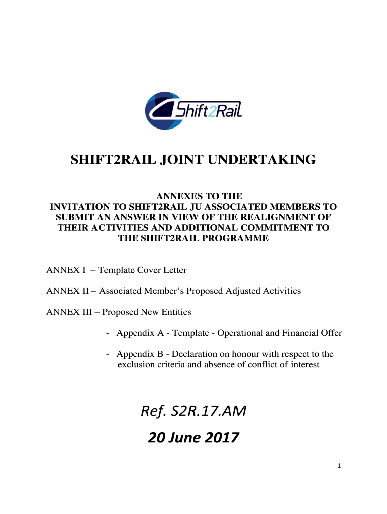 SHIFT2RAIL JOINT UNDERTAKING ANNEXES TO THE INVITATION TO SHIFT2RAIL JU ASSOCIATED MEMBERS TO SUBMIT AN ANSWER IN VIEW OF THE REALIGNMENT OF THEIR ACTIVITIES AND ADDITIONAL COMMITMENT TO THE SHIFT2RAIL
