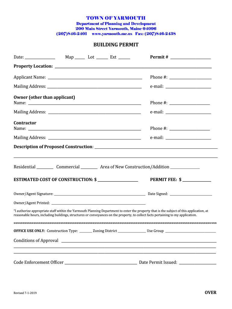 TOWN OF YARMOUTH Department of Planning and Development 200 Main Street Yarmouth, Maine 04096 (207)8462401 www.yarmouth.me.us Fax: (207)8462438BUILDING PERMIT Date: Map Lot Ext Permit # Property Location:
