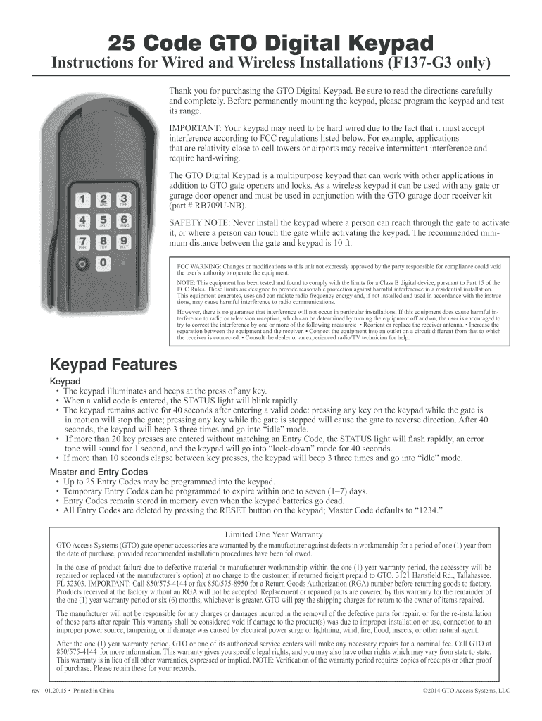 25 Code GTO Digital KeypadInstructions for Wired and Wireless Installations (F137G3 only)
