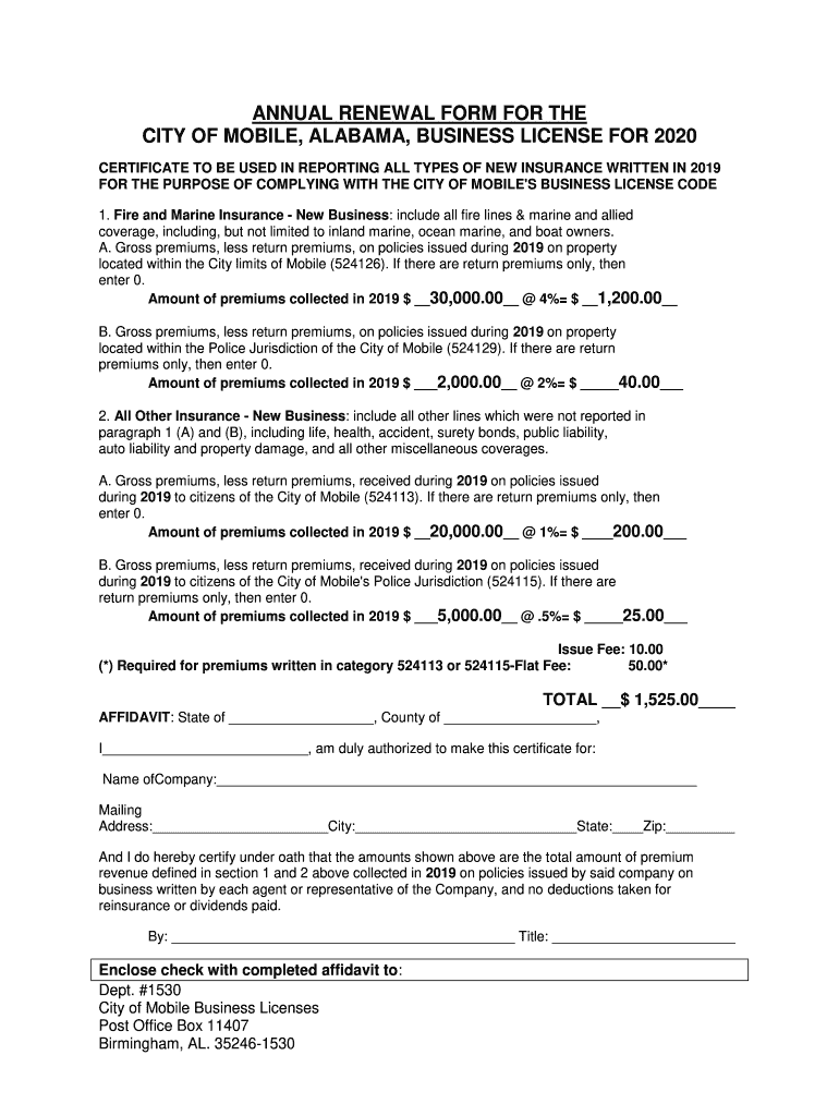 ANNUAL RENEWAL FORM FOR THE CITY OF MOBILE, ALABAMA, BUSINESS LICENSE FOR 2020 CERTIFICATE TO BE USED IN REPORTING ALL TYPES OF NEW INSURANCE WRITTEN IN 2019 FOR THE PURPOSE OF COMPLYING WITH THE