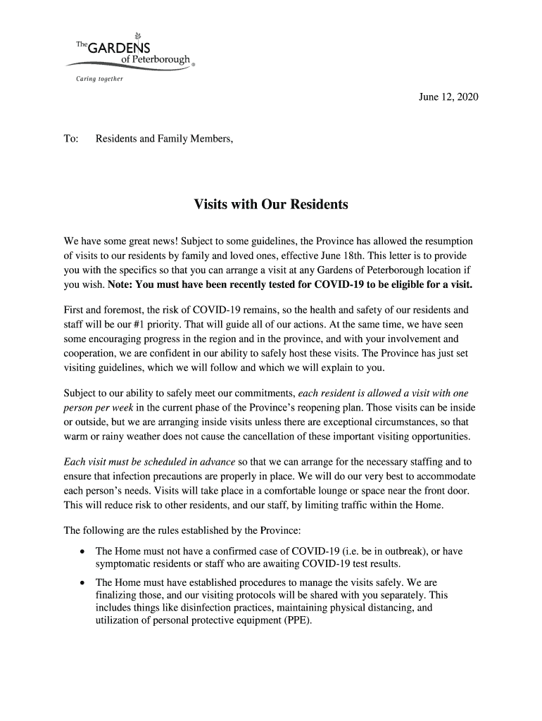 June 12, 2020To:Residents and Family Members, Visits with Our Residents
