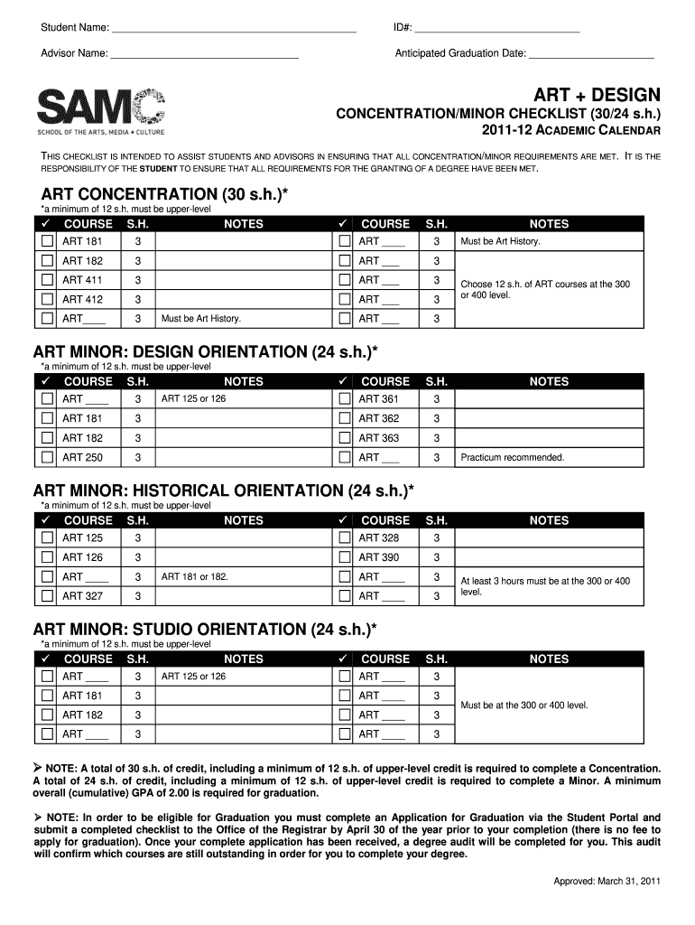 Student Name: ID#: Advisor Name: Anticipated Graduation Date: ART + DESIGN CONCENTRATION/MINOR CHECKLIST (30/24 s.h.) 201112 ACADEMIC CALENDAR THIS Checklists IS INTENDED TO ASSIST STUDENTS AND ADVISORS
