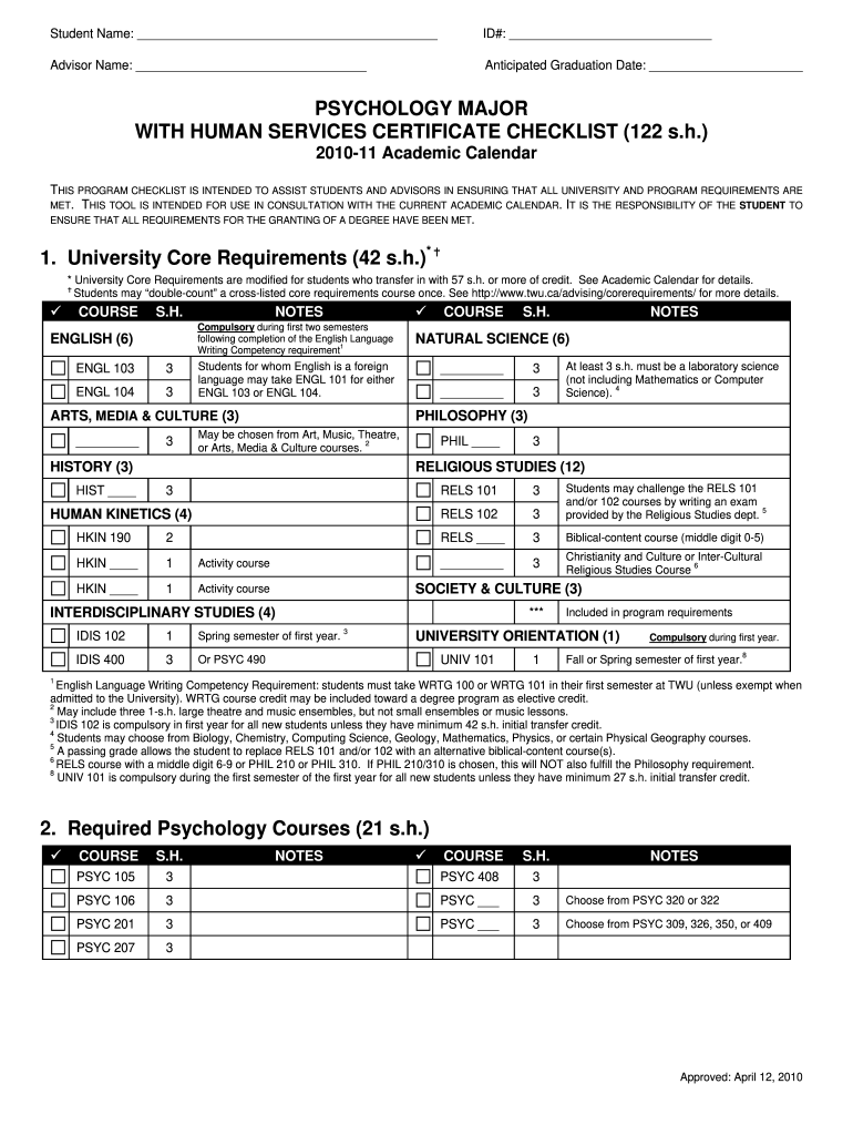 Student Name: ID#: Advisor Name: Anticipated Graduation Date: PSYCHOLOGY MAJOR WITH HUMAN SERVICES CERTIFICATE CHECKLIST (122 s.h.) 201011 Academic Calendar THIS PROGRAM Checklists IS INTENDED TO