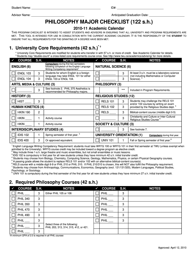 Student Name: ID#: Advisor Name: Anticipated Graduation Date: PHILOSOPHY MAJOR CHECKLIST (122 s.h.) 201011 Academic Calendar THIS PROGRAM Checklists IS INTENDED TO ASSIST STUDENTS AND ADVISORS IN