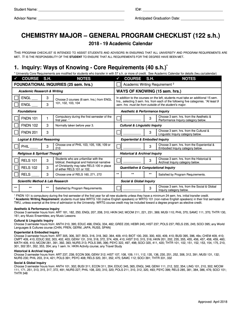Student Name: ID#: Advisor Name: Anticipated Graduation Date: CHEMISTRY MAJOR GENERAL PROGRAM CHECKLIST (122 s.h.) 2018 19 Academic Calendar THIS PROGRAM Checklists IS INTENDED TO ASSIST STUDENTS