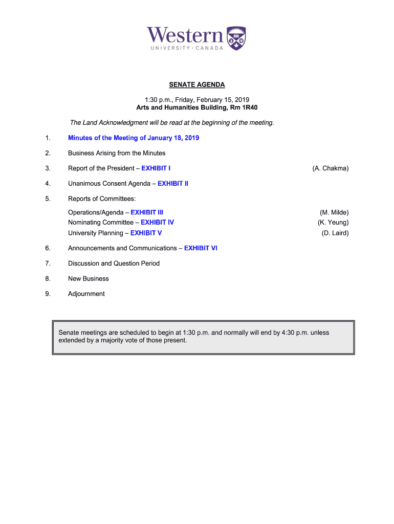 SENATE AGENDA 1:30 p.m., Friday, February 15, 2019, Arts and Humanities Building, Rm 1R40 The Land Acknowledgment will be read at the beginning of the meeting. 1. Minutes of the Meeting of January