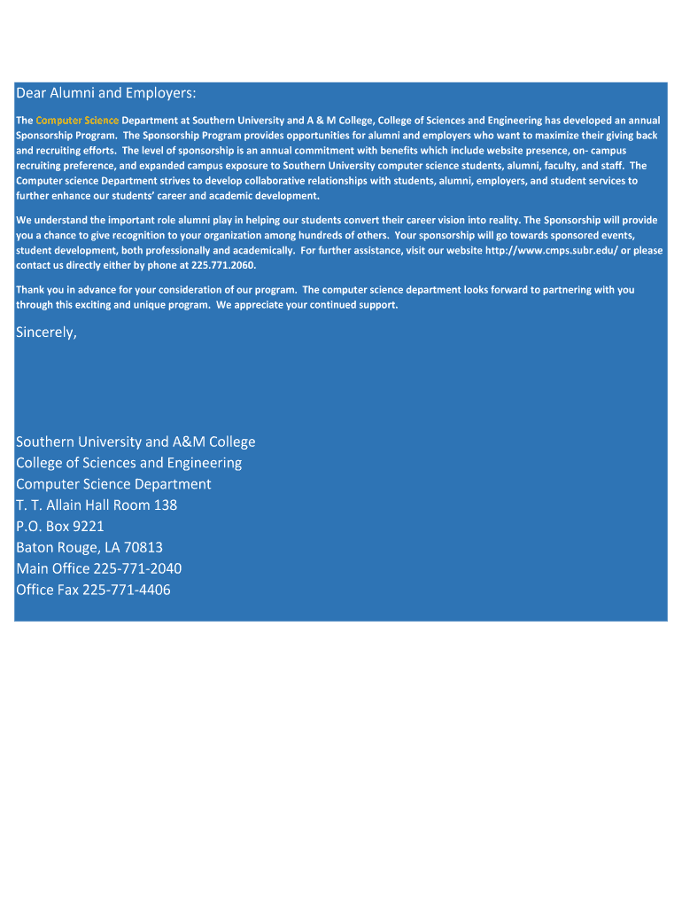 Dear Alumni and Employers: The Computer Science Department at Southern University and A & M College, College of Sciences and Engineering has developed an annual Sponsorship Program. The Sponsorship