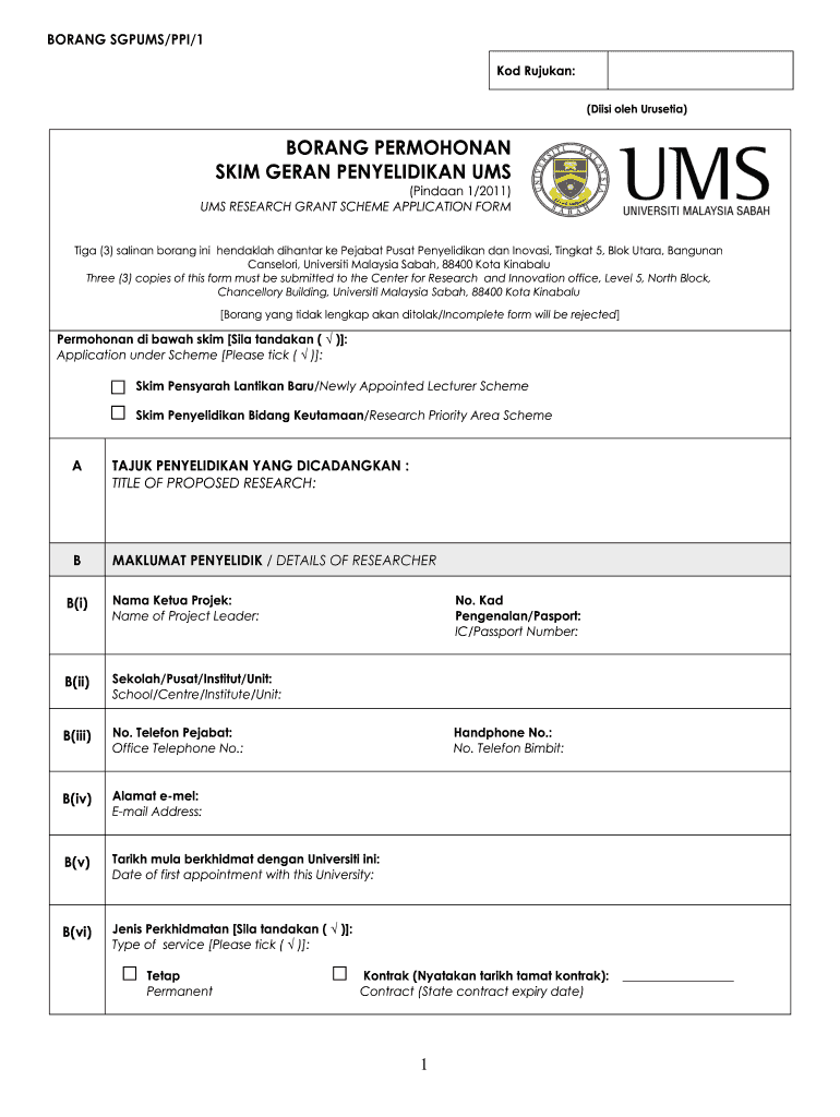 Faculty members and researchers at Universiti Malaysia Sabah are required to file Skim Geran Penyelidikan UMS.